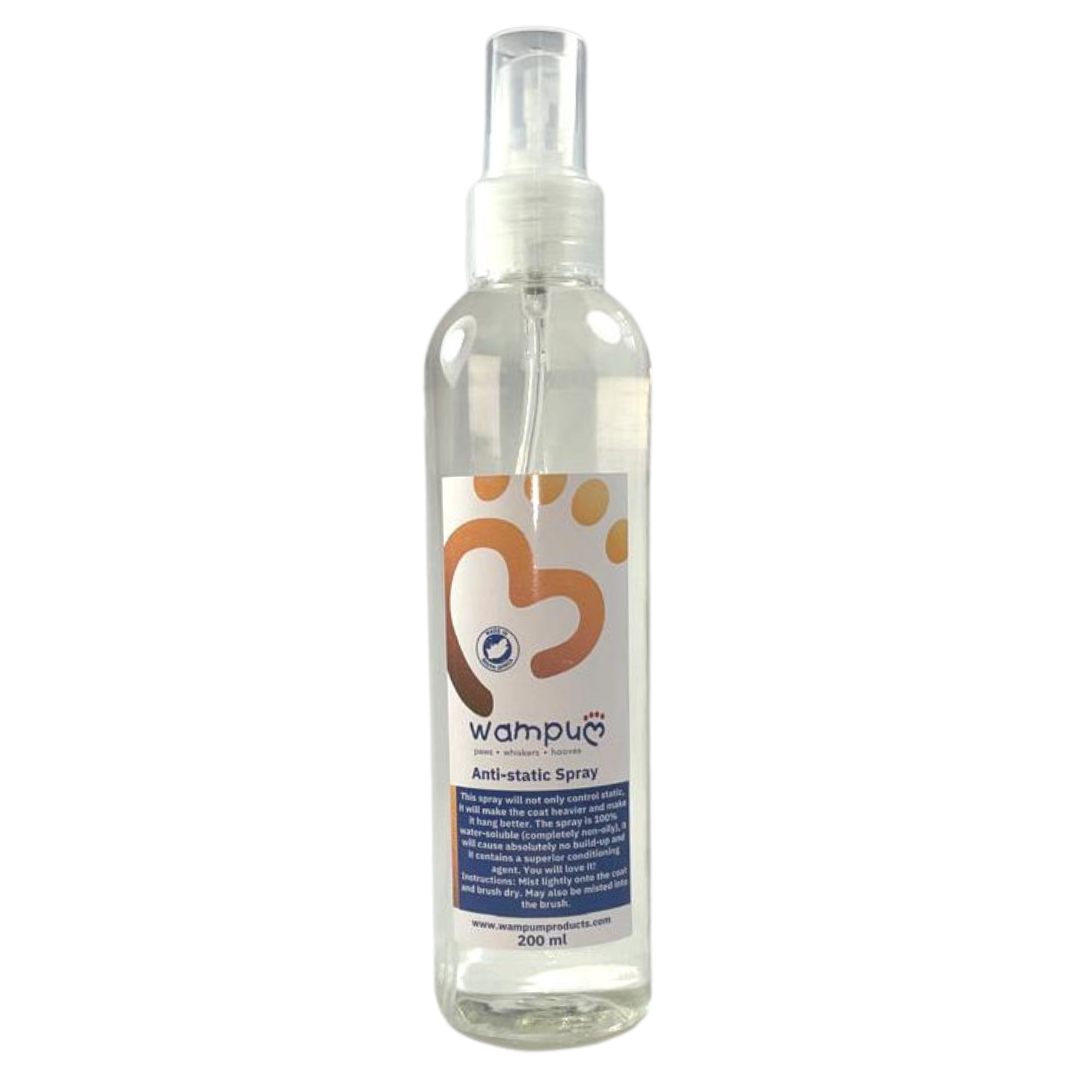 It is best applied to a coat by misting it lightly into the brush, and brushing it into the coat in layers. If you pick up static whilst ironing, you can also mist this product into your brush. It can be used on the bedding to further control static in the coat on hot and windy days, or indoors on static carpets.