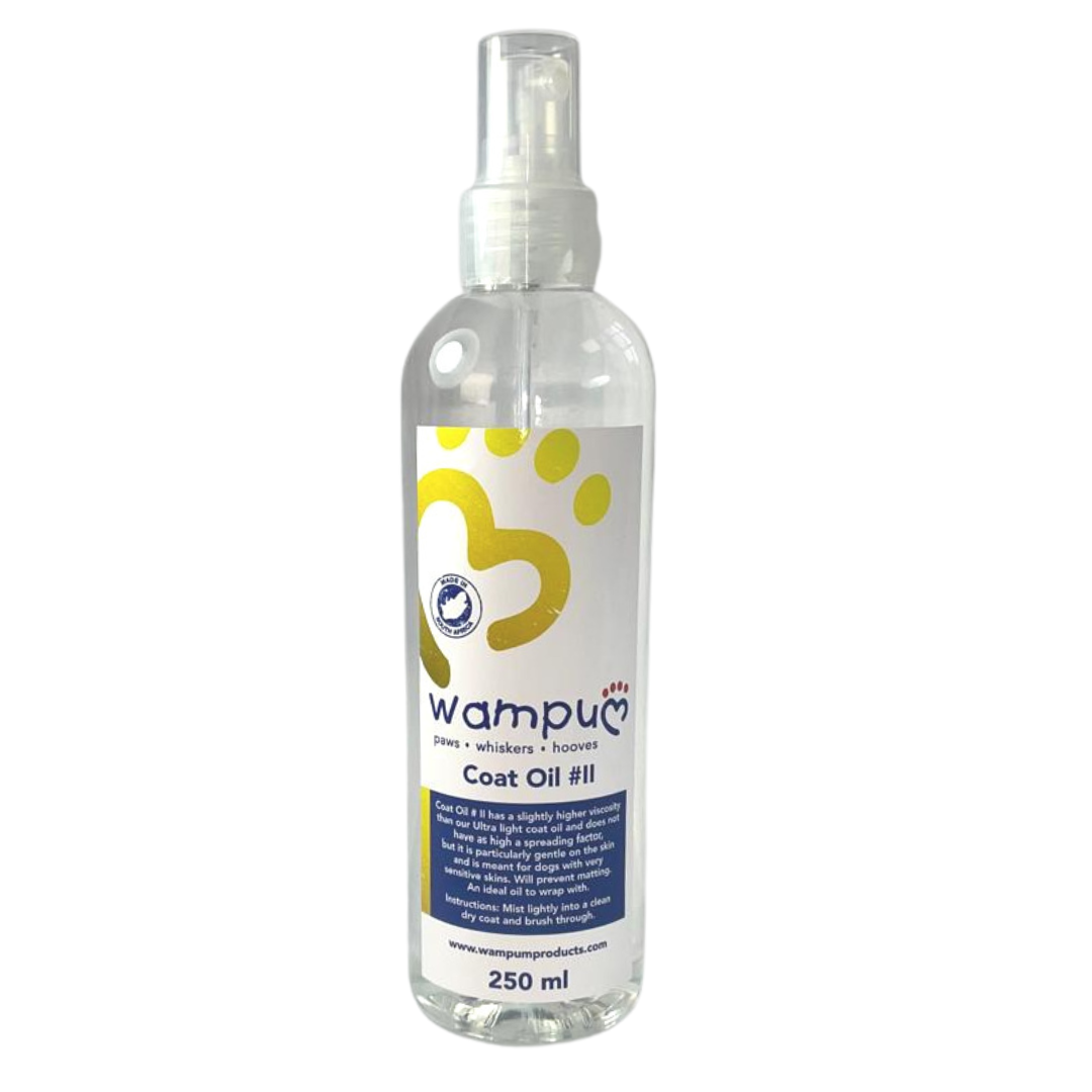Coat oil # II has a slightly higher viscosity than our Ultra light coat oil and does not have as high a spreading factor, but it is particularly gentle on the skin and is meant for dogs with very sensitive skins. Will prevent matting. An ideal oil to wrap with. Contains no mineral oil.