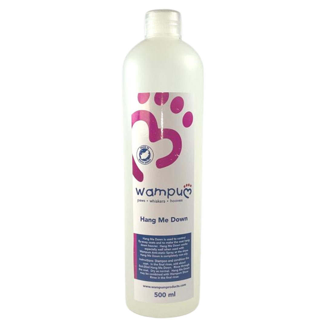 Shampoo and condition the coat. In the final rinse, add about 5ml-25ml Hang Me Down. Rinse through the coat. Dry as normal. Hang Me Down may be combined with Wampum Show Rinse in the final rinse.