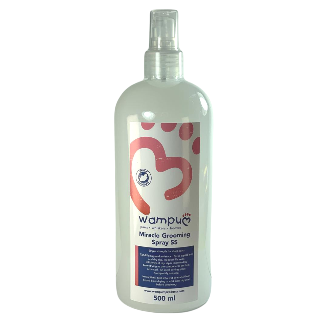 Mist into wet coat after bath before blow drying or mist onto dry coat before grooming.